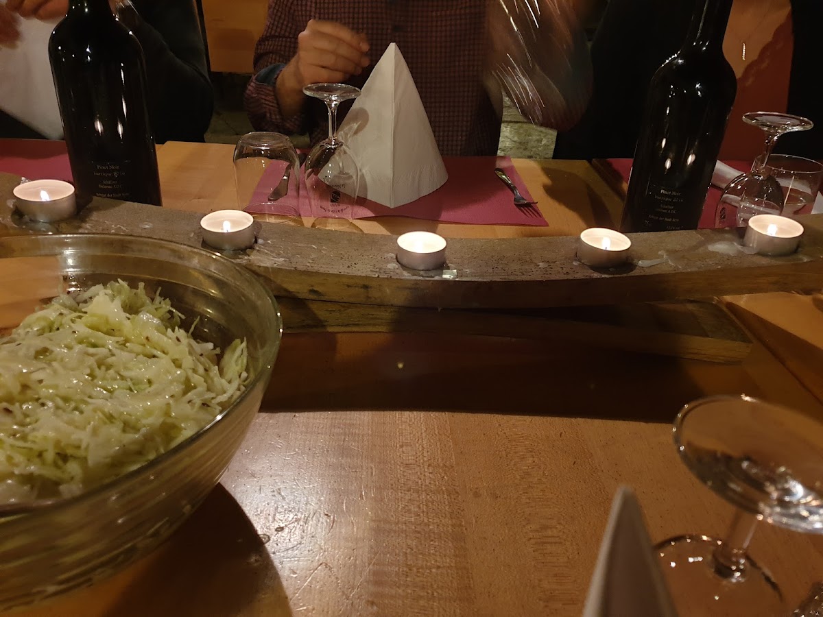 Très jolie cave avec un pressoir imposant. La salle est assez grande et la déco nous fait remonter le temps. Je m'y suis rendu pour un apéro, donc je ne peux que juger la cuisine sur ce qui nous a été proposé. Assiettes de charcuterie, fromage, pain, carottes et courgettes en bâtonnets (dips) avec une sauce rose. Le vin que j'ai pris (pinot noir 2020) était trop jeune à mon goût. Au final pour l'apéro ça va.